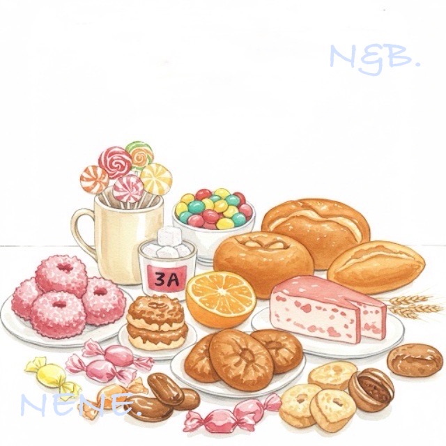 - 菓子類、ケーキ 🍰🍪:砂糖、飽和脂肪酸、トランス脂肪酸を多く含む。肥満、生活習慣病のリスクを高めます。